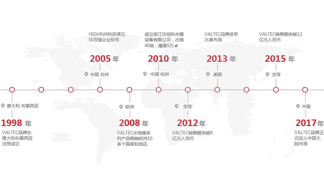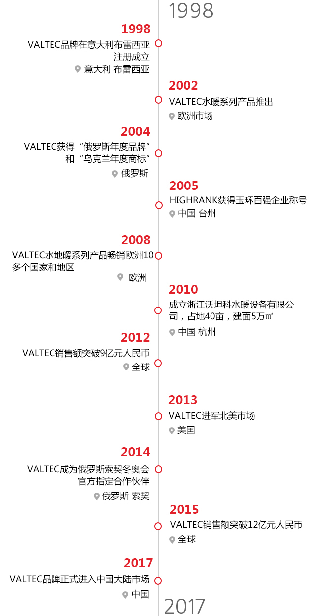 1998年,VALTEC品牌在意大利布雷西亚(Brescia)创立,经过20多年的发展,产品畅销全球20多个国家和地区,已成功进入欧洲、北美洲和亚洲等国际市场。